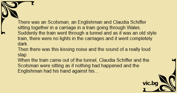 When the train came out of the tunnel, Claudia Schiffer and the Scotsman were sitting as if nothing had happened and the Englishman had his hand against his face as he had been slapped.