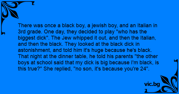 There was once a black boy, a jewish boy, and an Italian in 3rd grade. One day, they decided to play "who has the biggest diск". The Jew whipped it out, and then the Italian, and then the black. They looked at the black diск in astonishment, and told him it's huge because he's black.