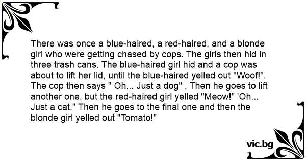 There was once a blue-haired, a red-haired, and a blonde girl who were getting chased by cops. The girls then hid in three trash cans. The blue-haired girl hid and a cop was about to lift her lid, until the blue-haired yelled out "Woof!". The cop then says " Oh... Just a dog" . Then he goes to lift another one, but the red-haired girl yelled "Meow!" 'Oh... Just a cat." Then he goes to the final one and then the blonde girl yelled out "Tomato!"