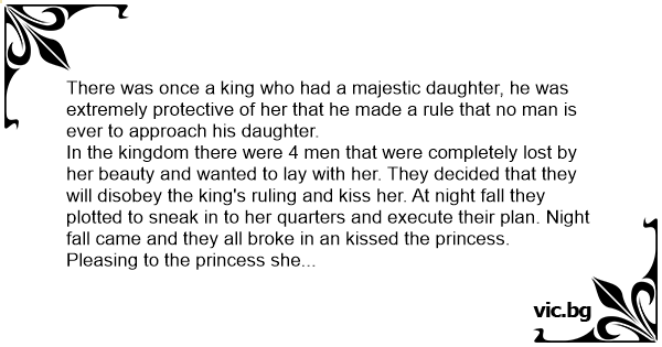 In the kingdom there were 4 men that were completely lost by her beauty and wanted to lay with her. They decided that they will disobey the king's ruling and kiss her. At night fall they plotted to sneak in to her quarters and execute their plan. Night fall came and they all broke in an kissed the princess.