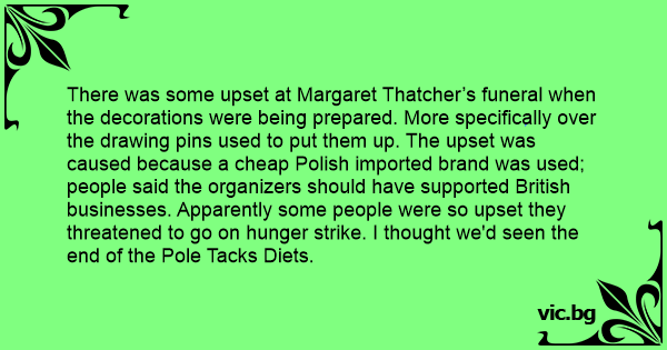 There was some upset at Margaret Thatcher’s funeral when the decorations were being prepared. More specifically over the drawing pins used to put them up. The upset was caused because a cheap Polish imported brand was used; people said the organizers should have supported British businesses. Apparently some people were so upset they threatened to go on hunger strike. I thought we'd seen the end of the Pole Tacks Diets.