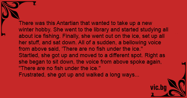 There was this Antartian that wanted to take up a new winter hobby. She went to the library and started studying all about ice fishing. Finally, she went out on the ice, set up all her stuff, and sat down. All of a sudden, a bellowing voice from above said, 'There are no fish under the ice."