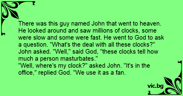 There was this guy named John that went to heaven. He looked around and saw millions of clocks, some were slow and some were fast. He went to God to ask a question. "What's the deal with all these clocks?" John asked. "Well," said God, "these clocks tell how much a person masturbates."