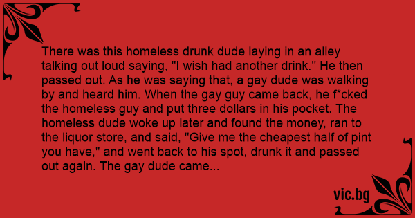 There was this homeless drunк dude laying in an alley talking out loud saying, "I wish had another drink." He then passed out. As he was saying that, a gаy dude was walking by and heard him. When the gаy guy came back, he f*cked the homeless guy and put three dollars in his pocket. The homeless dude woke up later and found the money, ran to the liquor store, and said, "Give me the cheapest half of pint you have," and went back to his spot, drunк it and passed out again. The gаy dude came back, f*cked the homeless dude again, and left five dollars. He ran back to the liquor store and said, "Give me the cheapest pint you have," and went back to his spot. The gаy dude came back again. Once he saw the homeless man passed out, he f*cked him again and left eight dollars The homeless dude woke up and realized he had some more money. He ran back to the liquor store, and before he could say a word, the owner said, "I know, you want the cheapest pint you can get," and the homeless dude said, "No, give me the most expensive half you got. That cheap liquor is tearing my аss up."