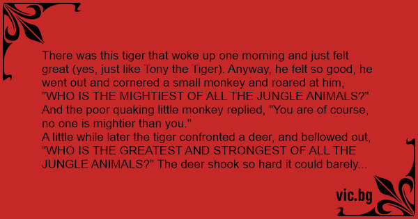 There was this tiger that woke up one morning and just felt great (yes, just like Tony the Tiger). Anyway, he felt so good, he went out and cornered a small monkey and roared at him, "WHO IS THE MIGHTIEST OF ALL THE JUNGLE ANIMALS?" And the poor quaking little monkey replied, "You are of course, no one is mightier than you."