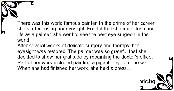 There was this world famous painter. In the prime of her career, she started losing her eyesight. Fearful that she might lose her life as a painter, she went to see the best eye surgeon in the world.