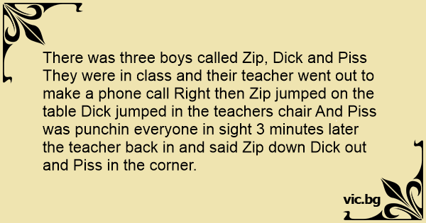 There was three boys called Zip, Diск and Рiss They were in class and their teacher went out to make a phone call Right then Zip jumped on the table Diск jumped in the teachers chair And Рiss was punchin everyone in sight 3 minutes later the teacher back in and said Zip down Diск out and Рiss in the corner.