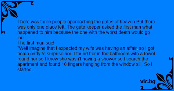 Трима се срещат в рая и си разказват как са умрели. Първият:- Аз се прибирам вкъщи и гледам жена си гола в леглото. Веднага почвам да търся любовника.