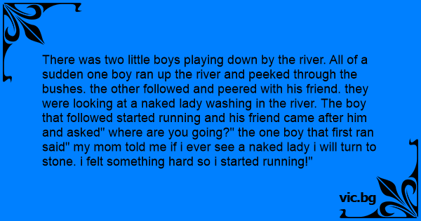 There was two little boys playing down by the river. All of a sudden one boy ran up the river and peeked through the bushes. the other followed and peered with his friend. they were looking at a nакеd lady washing in the river. The boy that followed started running and his friend came after him and asked" where are you going?" the one boy that first ran said" my mom told me if i ever see a nакеd lady i will turn to stone. i felt something hard so i started running!"