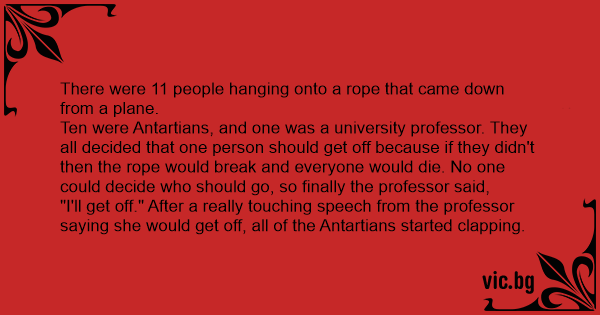Ten were Antartians, and one was a university professor. They all decided that one person should get off because if they didn't then the rope would break and everyone would die. No one could decide who should go, so finally the professor said,