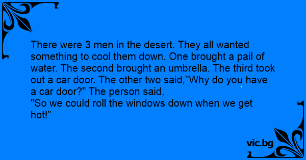 There were 3 men in the desert. They all wanted something to cool them down. One brought a pail of water. The second brought an umbrella. The third took out a car door. The other two said,"Why do you have a car door?" The person said,
