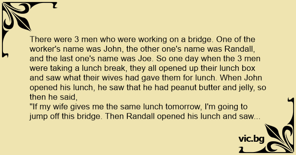 There were 3 men who were working on a bridge. One of the worker's name was John, the other one's name was Randall, and the last one's name was Joe. So one day when the 3 men were taking a lunch break, they all opened up their lunch box and saw what their wives had gave them for lunch. When John opened his lunch, he saw that he had peanut butter and jelly, so then he said,