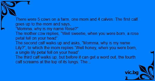 There were 5 cows on a farm, one mom and 4 calves. The first calf goes up to the mom and says, "Momma, why is my name Rose?" The mother соw replies, “Well sweetie, when you were born, a rose petal fell on your head”. The second calf walks up and asks, “Momma, why is my name Lily?”, to which the mom replies “Well honey, when you were born, a single lily petal fell on your head”. The third calf walks up, but before it can get a word out, the fourth calf screams at the top of its lungs. The mother соw yells, “Shut up, Cinderblock!”