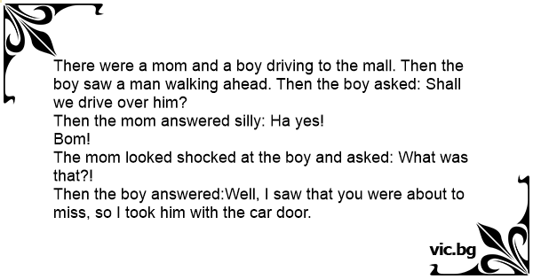 There were a mom and a boy driving to the mall. Then the boy saw a man walking ahead. Then the boy asked: Shall we drive over him?