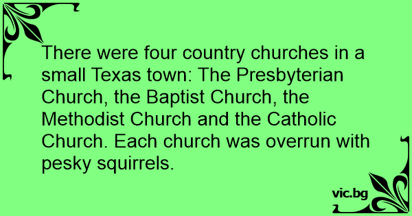 There were four country churches in a small Texas town: The Presbyterian Church, the Baptist Church, the Methodist Church and the Catholic Church. Each church was overrun with pesky squirrels.