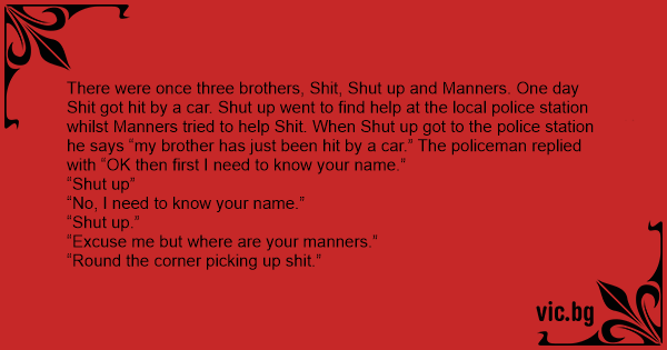 There were once three brothers, Shiт, Shut up and Manners. One day Shiт got hit by a car. Shut up went to find help at the local police station whilst Manners tried to help Shiт. When Shut up got to the police station he says “my brother has just been hit by a car.” The policeman replied with “OK then first I need to know your name.”