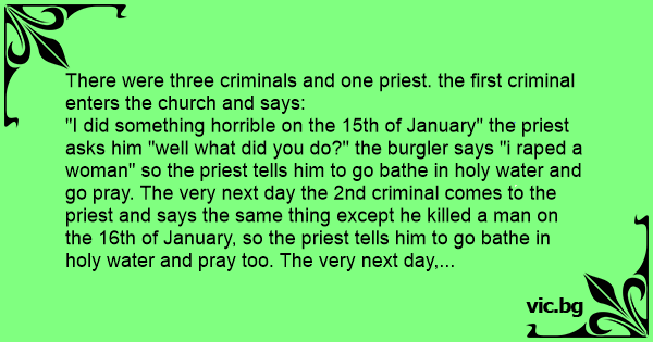 "I did something horrible on the 15th of January" the priest asks him "well what did you do?" the burgler says "i rареd a woman" so the priest tells him to go bathe in holy water and go pray. The very next day the 2nd criminal comes to the priest and says the same thing except he killed a man on the 16th of January, so the priest tells him to go bathe in holy water and pray too. The very next day, Finally the 3rd criminal comes to the priest and says "I DID SOMETHING REALLY REALLY BAD" the priest says "well what did you do?"