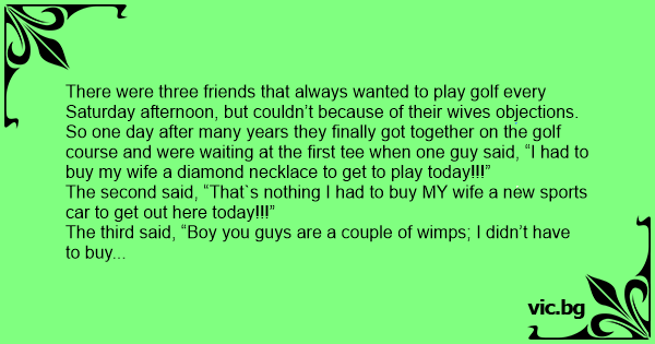 So one day after many years they finally got together on the golf course and were waiting at the first tee when one guy said, “I had to buy my wife a diamond necklace to get to play today!!!”
