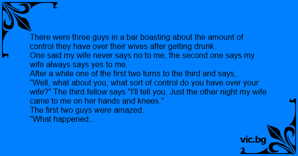 "Well, what about you, what sort of control do you have over your wife?" The third fellow says "I'll tell you. Just the other night my wife came to me on her hands and knees."