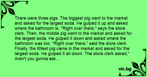 There were three pigs. The biggest pig went to the market and asked for the largest soda. He gulped it up and asked where the bathroom is. "Right over there," says the store clerk. Then, the middle pig went to the market and asked for the largest soda. He gulped it down and asked where the bathroom was too. "Right over there," said the store clerk. Finally, the littlest pig came in the market and asked for the largest soda. He gulped it all down. The store clerk asked," Aren't you gonna ask where the bathroom is?"