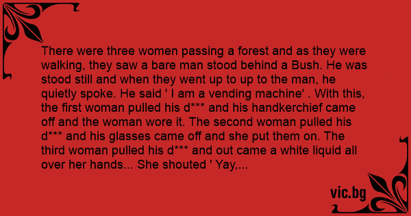 There were three women passing a forest and as they were walking, they saw a bare man stood behind a Bush. He was stood still and when they went up to up to the man, he quietly spoke. He said ' I am a vending machine' . With this, the first woman pulled his d*** and his handkerchief came off and the woman wore it. The second woman pulled his d*** and his glasses came off and she put them on. The third woman pulled his d*** and out came a white liquid all over her hands... She shouted ' Yay, shampoo!'
