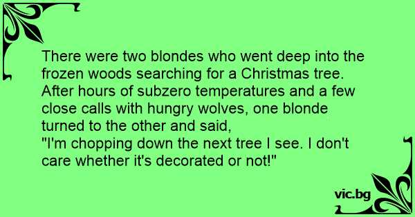 Dvě blondýny se rozhodnou, že vyrazí do lesa pro vánoční stromeček. Bloudí po lese, hodinu, dvě, tři... Pak se ozve: „Ivano, máš něco?” „Ne, vůbec nic. A ty?” „Já taky ne. Tak co kdybychom vzaly...