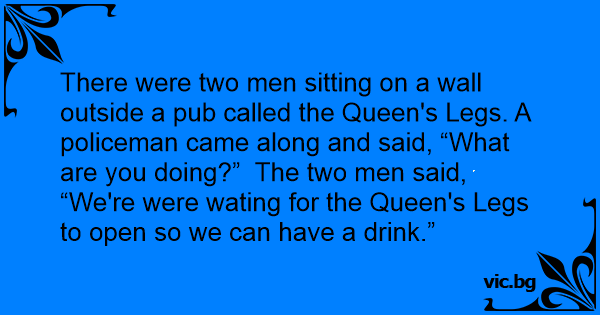 There were two men sitting on a wall outside a pub called the Queen's Legs. A policeman came along and said, “What are you doing?” The two men said, “We're were wating for the Queen's Legs to open so we can have a drink.”