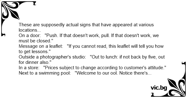 These are supposedly actual signs that have appeared at various locations...