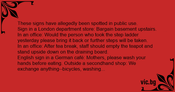 English sign in a German café: Mothers, please wash your hands before eating. Outside a secondhand shop: We exchange anything--bicycles, washing machines, etc. Why not bring your wife along and get a wonderful bargain.