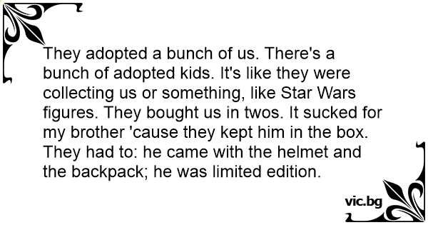 They adopted a bunch of us. There's a bunch of adopted kids. It's like they were collecting us or something, like Star Wars figures. They bought us in twos. It suскеd for my brother 'cause they kept him in the box. They had to: he came with the helmet and the backpack; he was limited edition.