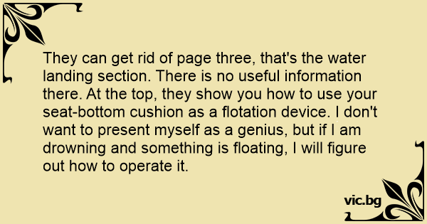 They can get rid of page three, that's the water landing section. There is no useful information there. At the top, they show you how to use your seat-bottom cushion as a flotation device. I don't want to present myself as a genius, but if I am drowning and something is floating, I will figure out how to operate it.