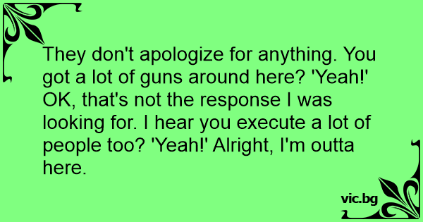 They don't apologize for anything. You got a lot of guns around here? 'Yeah!' OK, that's not the response I was looking for. I hear you execute a lot of people too? 'Yeah!' Alright, I'm outta here.