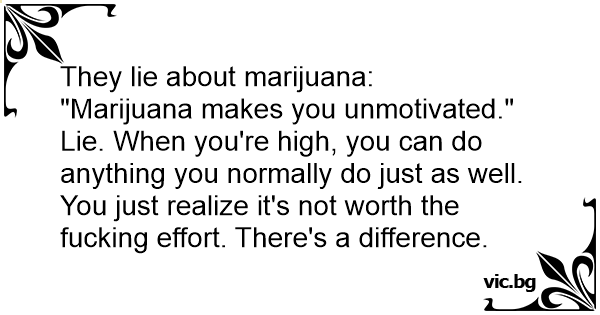 "Marijuana makes you unmotivated." Lie. When you're high, you can do anything you normally do just as well. You just realize it's not worth the fuскing effort. There's a difference.