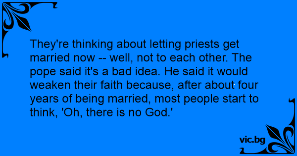 They're thinking about letting priests get married now -- well, not to each other. The pope said it's a bad idea. He said it would weaken their faith because, after about four years of being married, most people start to think, 'Oh, there is no God.'