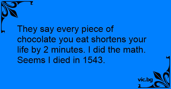 They say every piece of chocolate you eat shortens your life by 2 minutes. I did the math. Seems I died in 1543.