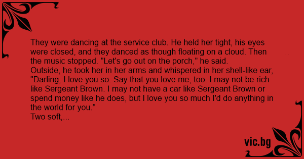 Outside, he took her in her arms and whispered in her shell-like ear, "Darling, I love you so. Say that you love me, too. I may not be rich like Sergeant Brown. I may not have a car like Sergeant Brown or spend money like he does, but I love you so much I'd do anything in the world for you."