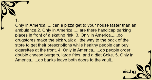 Only in America......can a pizza get to your house faster than an ambulance.2. Only in America......are there handicap parking places in front of a skating rink. 3. Only in America......do drugstores make the sick walk all the way to the back of the store to get their prescriptions while healthy people can buy cigarettes at the front. 4. Only in America......do people order double cheese burgers, large fries, and a diet Coke. 5. Only in America......do banks leave both doors to the vault open and then chain the pens to the counters. 6. Only in America......do we leave cars worth thousands of dollars in the driveway and put our useless junk in the garage. 7. Only in America......do we use answering machines to screen calls and then have call waiting so we won't miss a call from someone we didn't want to talk to in the first place. 8. Only in America......do we buy hot dogs in packages of ten and buns in packages of eight. 9. Only in America......do we use the word 'politics' to describe the process so well: Poli' in Latin meaning 'many' and 'tics' meaning 'bloodsucking creatures'. 10. Only in America......do they have drive-up ATM machines with Braille lettering.