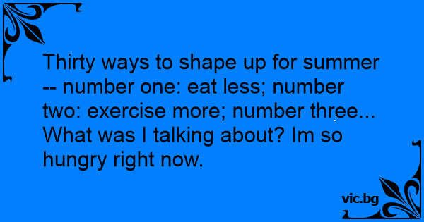 Thirty ways to shape up for summer -- number one: eat less; number two: exercise more; number three... What was I talking about? Im so hungry right now.