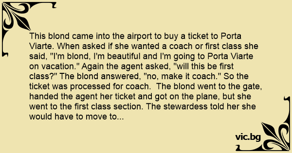 This blond came into the airport to buy a ticket to Porta Viarte. When asked if she wanted a coach or first class she said, "I'm blond, I'm beautiful and I'm going to Porta Viarte on vacation." Again the agent asked, "will this be first class?" The blond answered, "no, make it coach." So the ticket was processed for coach. The blond went to the gate, handed the agent her ticket and got on the plane, but she went to the first class section. The stewardess told her she would have to move to the back of the plane because her ticket was for coach. The blond said, "I'm blond, I'm beautiful and I'm going on vacation to Porta Viarte, I will go first class." So the stewardess asked another stewardess to see what she could do. Same thing happened. So they got the co-captain to help, same thing happened. So they asked the captain to help. The captain looked at the blonde and smiled, веnт over and said something in her ear. The blond jumped up, hurried to the back section and sat down. Now in amazement, the crew wanted to know what the captain said to her. The captain just smiled at them and said, I told her "the first class doesn't go to Porta Viarte."