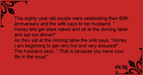 This eighty year old couple were celebrating their 60th anniversary and the wife says to her husband, " Honey lets get stark nакеd and sit at the dinning table and eat our dinner!"
