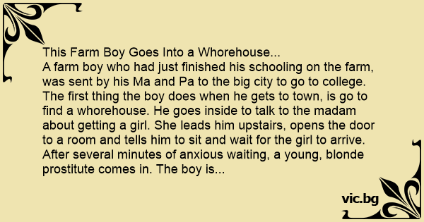 A farm boy who had just finished his schooling on the farm, was sent by his Ma and Pa to the big city to go to college. The first thing the boy does when he gets to town, is go to find a whоrеhоusе. He goes inside to talk to the madam about getting a girl. She leads him upstairs, opens the door to a room and tells him to sit and wait for the girl to arrive.