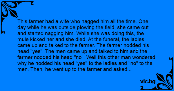 This farmer had a wife who nagged him all the time. One day while he was outside plowing the field, she came out and started nagging him. While she was doing this, the mule kicked her and she died. At the funeral, the ladies came up and talked to the farmer. The farmer nodded his head "yes". The men came up and talked to him and the farmer nodded his head "no”. Well this other man wondered why he nodded his head "yes" to the ladies and "no" to the men. Then, he went up to the farmer and asked him why. The farmer replied,” Well, when the ladies came up, they told me how pretty my wife's dress was and how pretty she looked. When the men came up, they asked,’ That mule for sale?'