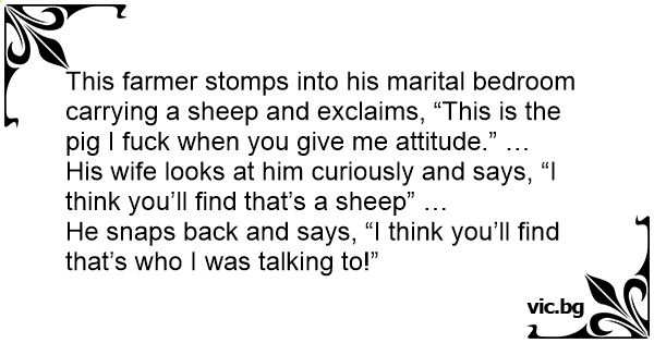 This farmer stomps into his marital bedroom carrying a sheep and exclaims, “This is the pig I fuск when you give me attitude.” …