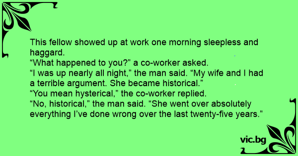 “I was up nearly all night,” the man said. “My wife and I had a terrible argument. She became historical.”