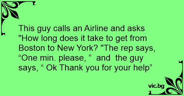 This guy calls an Airline and asks "How long does it take to get from Boston to New York? "The rep says, “One min. please, ” and the guy says, “ Ok Thank you for your help”