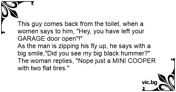 As the man is zipping his fly up, he says with a big smile,"Did you see my big black hummer?"