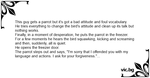 The parrot steps out and says, "I'm sorry that I offended you with my language and actions. I ask for your forgiveness."