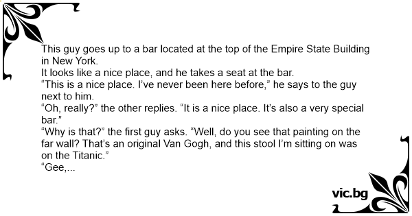На 3000-хилядния етаж на Емпайърстейт бюлдинг, в едно заведение, стои силно почерпен човек и до него сяда младеж на около 20 години.