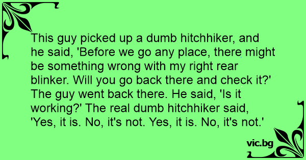 This guy picked up a dumb hitchhiker, and he said, 'Before we go any place, there might be something wrong with my right rear blinker. Will you go back there and check it?' The guy went back there. He said, 'Is it working?' The real dumb hitchhiker said, 'Yes, it is. No, it's not. Yes, it is. No, it's not.'