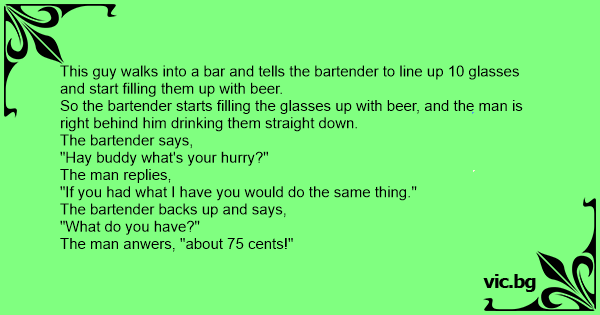 This guy walks into a bar and tells the bartender to line up 10 glasses and start filling them up with вееr.